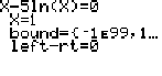 "Solver screen 1": equation on top, X=some number below that, and BOUND and left-rt thingies below that.