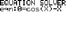 First of all, the only equations the calculator can solve are of the form some function=0. This sounds like a limitation, but it's not, because any algebra problem can be recast that way. For instance, if you want to find out where cos(x)=x, you simply rewrite the problem as cos(x)-x=0. Now, let's see how we would approach that problem.
